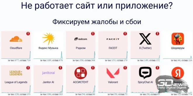 В указанное время пользователи из России, Европы и США начали сообщать о недоступности популярных сайтов и сервисов. Среди них — X (бывший Twitter), Spotify, ChatGPT и даже платформа для отслеживания сбоев Downdetector.com. У многих сайтов отображалось сообщение: *«Чтобы продолжить, разблокируйте challenges.cloudflare.com»*.